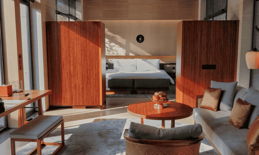 Adorned with soft, earthy tones and natural wood accents, the decor reflects the essence of a peaceful forest bathed in moonlight. A plush king-size bed draped with fine linens invites you to unwind, while the delicate glow of thoughtfully placed lighting creates an ambiance of warmth and relaxation. The room features large windows with sheer curtains that open up to views of a private garden or lush greenery, ensuring you stay connected to the beauty of the outdoors.